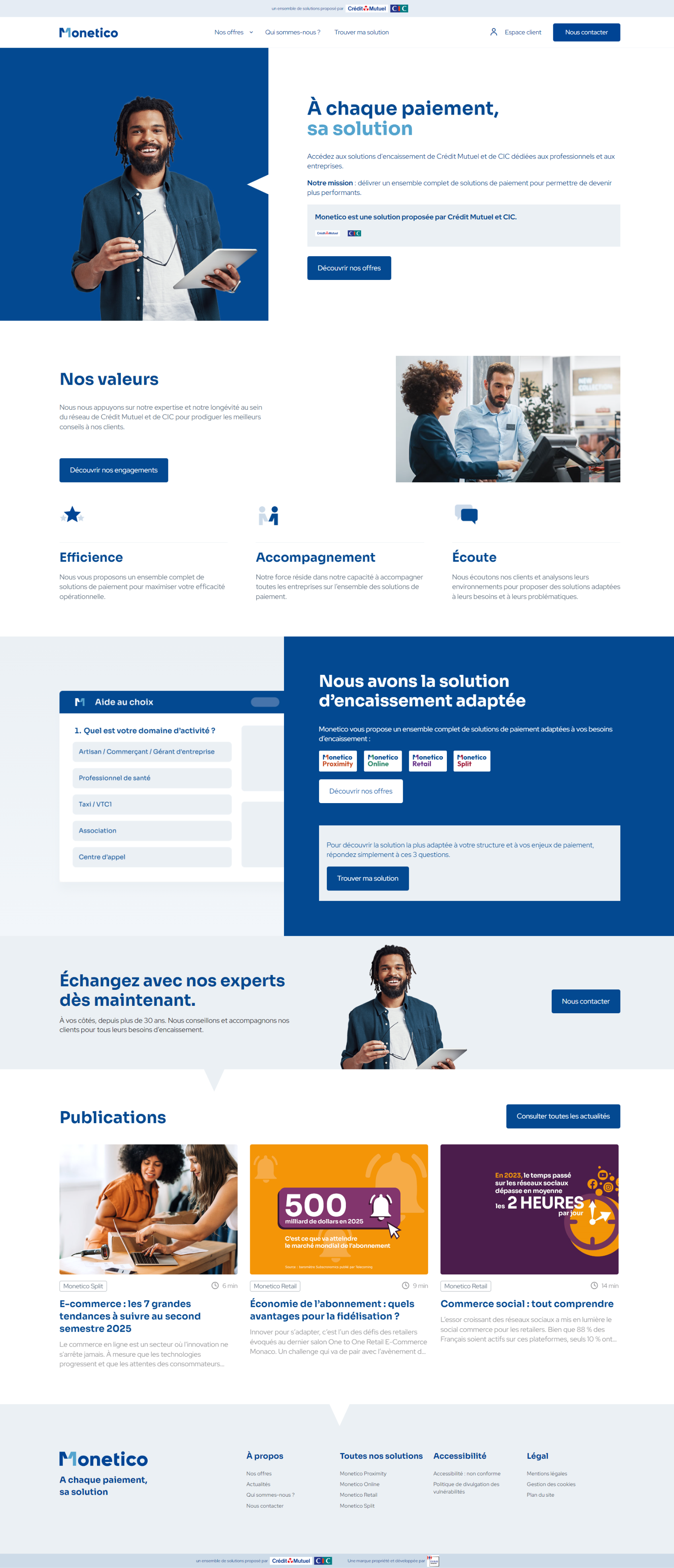J’ai eu, comme souvent, un rôle assez transversal sur ce projet. J’ai pris en charge l’ensemble du développement du site principal Monetico, ainsi que des sous-domaines Monetico Online, Monetico Retail, Monetico Proximity et Monetico Split.